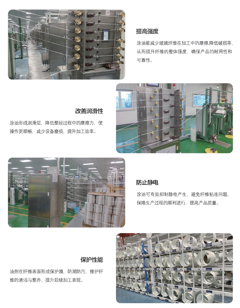 整經(jīng)涂油裝置在玻璃纖維生產(chǎn)線中起到了重要的作用。它主要用于對(duì)紗線進(jìn)行涂油處理,以提高紗線的柔軟性和潤(rùn)滑性,減少纖維之間的摩擦和斷裂,從而提高紗線的質(zhì)量和生產(chǎn)效率。下面是整經(jīng)涂油裝置在玻璃纖維生產(chǎn)線中的作用: